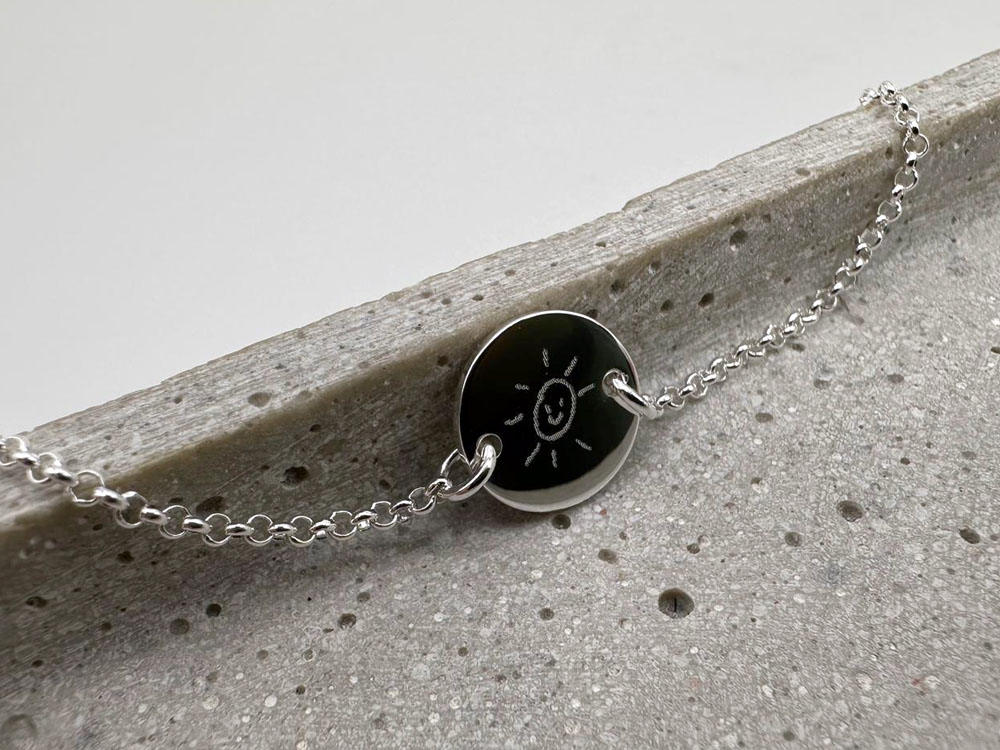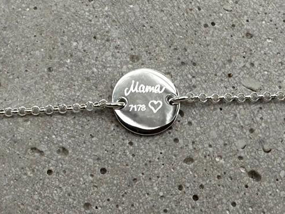 Dieses Armband mit einem 11 mm breitem, gravierbarem runden Gravur Anhänger ist aus 925er Silber und wird in unserem Atelier für Sie mit Ihrem individuellem Text personalisiert. So wird das silberne Armband mit Gravur Plättchen zu einer persönlichen Geschenkidee und zu einem individuellen Geschenk. Das Armband hat eine Gesamtlänge von 19 cm und lässt sich in der Größe 16 bis 19 cm verstellen.