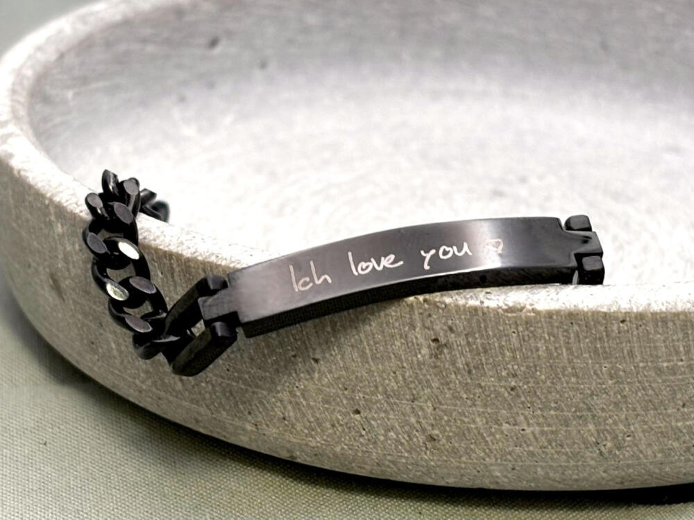 Auf der großen Gravurfläche haben Individuelle Grafiken, Handschriften und auch Notfall Informationen wie Telefonnummern, Krankheiten und Allergikerhinweise Platz. Es eignet sich auch als Demenzarmband und  SOS Armband.