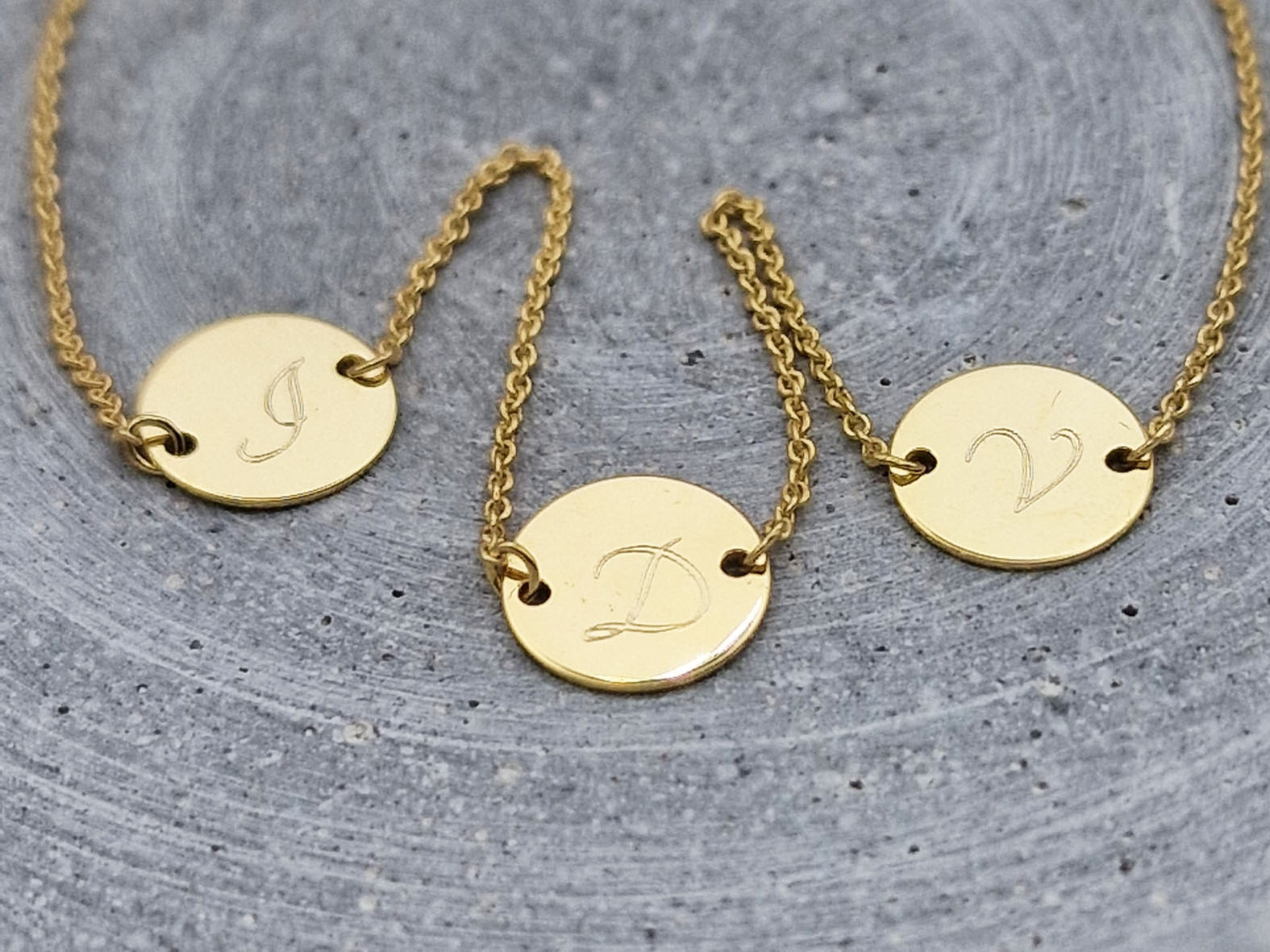 Dieses Armband mit drei 8 mm breitem, gravierbarem runden Gravur Anhänger ist aus hochwertigem 333er Gold und wird in unserem Atelier für Sie mit Ihrem individuellem Text personalisiert. So wird das echt goldene Armband mit drei Gravur Plättchen zu einer persönlichen Geschenkidee und zu einem individuellen Geschenk. Das Armband hat eine Gesamtlänge von 19,5 cm und lässt sich in der Größe 17 und 19,5 cm verstellen.
