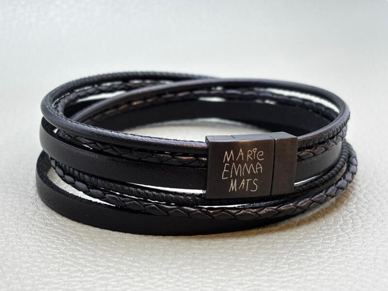Dieses  zweifach gewickelte Lederband für Männer wird aus einem 5 mm breitem Riemen aus Rindsleder, 2,5 mm breiten Nappaleder und einem geflochtenem Leder-Band gefertigt. Die gesamte Breite des Bandes beträgt ca. 1 cm, es wird doppelt um das Handgelenk getragen. Sie können das Armband mit einem Würfel ergänzen. Das Armband ist zweifach gewickelt ->Bitte bedenken Sie ein wenig Spielraum (0,5 – 1 cm) mehr anzugeben. Gestalten Sie den Verschluss oder das Leder direkt in unserem Gravurgestalter und werden so zum Schmucksdesigner!