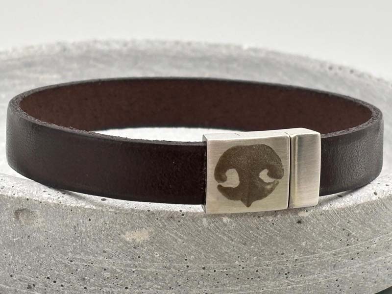 Handgefertigtes Armband mit Gravur aus echtem Rindsleder mit Magnetverschluss. Der Lederriemen ist ca. 1 cm breit. Auf den Riemen können Sie einen individuellen Wunschtext stempeln lassen. In echter Handarbeit wird jeder Buchstabe Ihres Wunschtextes mit einem Punziereisen in das Leder geschlagen (bei einer Prägung auf der Innenseite kann dadurch eine leichte Druckstelle auf der Vorderseite sichtbar werden). Wie wäre es mit einem Namen oder dem Datum des Hochzeitstages oder mit der Stempelung der Koordinaten der ersten Begegnung oder des Geburtsortes? Außerdem lässt sich der Magnetverschluss individuell gravieren. Geben Sie einfach die gewünschten Zeichen oder Symbole an.