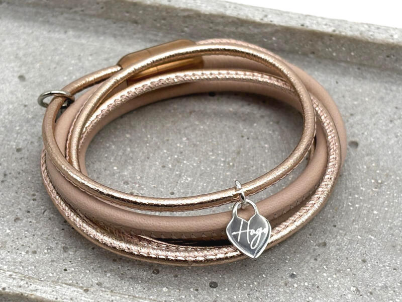 Lederarmband für Damen aus 4 mm und 2,5 mm breitem, feinsten Nappaleder zweifach gewickelt mit einem Magnetverschluss aus Chirurgenstahl. Das 4 mm breite Nappaleder ist in der Farbe Rosé und die beiden 2,5 mm breiten Lederbänder sind in Roségold oder wählen Sie die Variante in Silber. Durch viele verschiedene Gravuranhänger wird es zu einem sehr besonderen Lederarmband für Damen. Diese können Sie im Warenkorb zusätzlich auswählen.