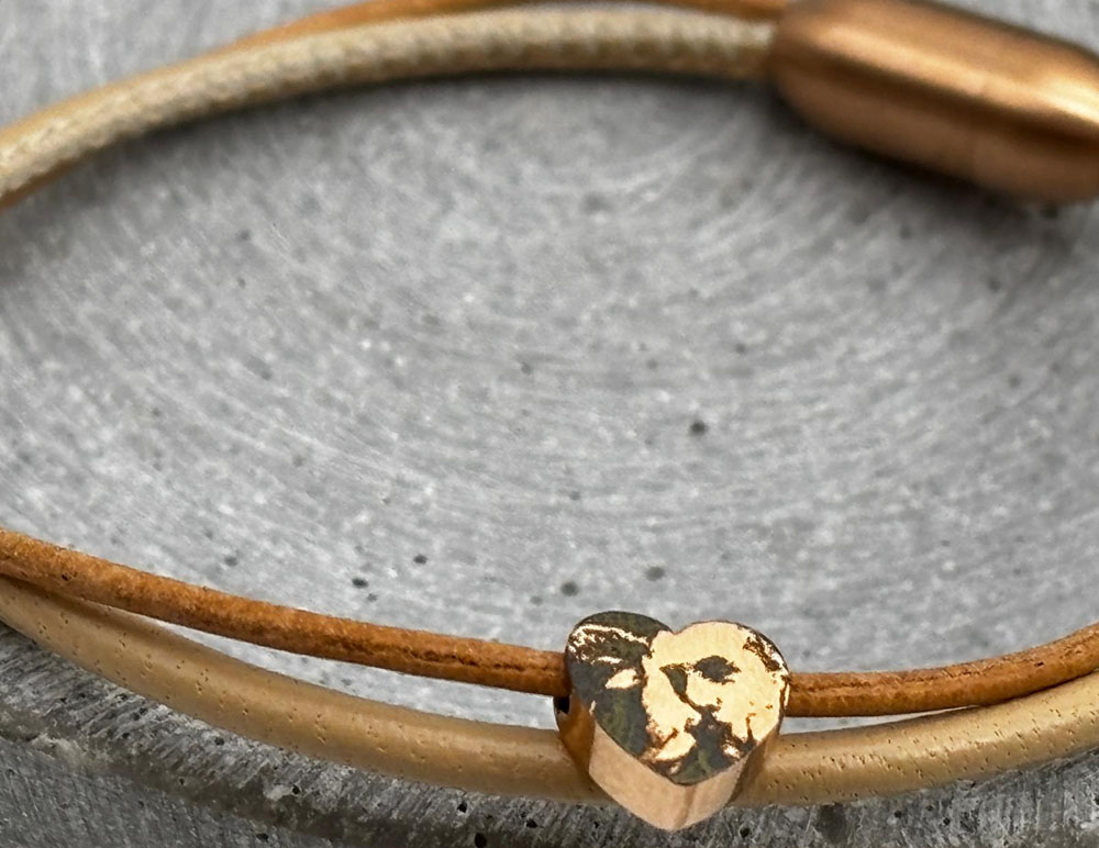 Optional kann ein kleines Herz-Element auf das Lederband aufgefädelt werden. Diese Option wählen Sie bequem im Warenkorb aus.