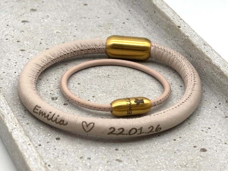 Das Set besteht aus zwei Lederarmbändern in unterschiedlichen Stärken. Das Damenarmband wird aus 6 mm starkem Nappaleder gefertigt, während das Kinderarmband mit 3 mm feinem Leder angenehm leicht am Handgelenk sitzt. Beide Armbänder sind mit einem stabilen Verschluss aus Chirurgenstahl ausgestattet, der optional individuell graviert werden kann.