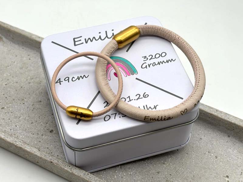 Optional ist das Mutter Tochter Armband Set auch mit einer passenden Erinnerungsdose erhältlich. Die Dose kann mit den Geburtsdaten Ihres Kindes personalisiert werden und eignet sich ideal zur Aufbewahrung oder als Geschenkverpackung.