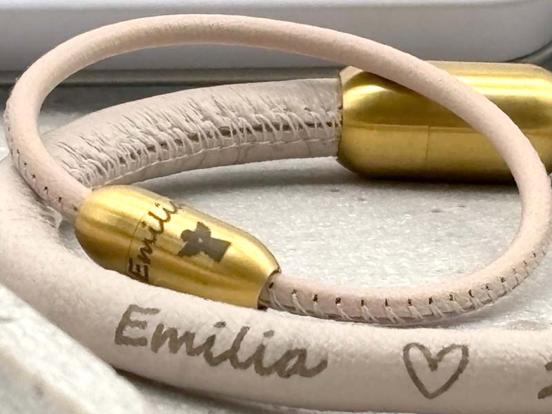 Die Lasergravur kann ganz nach Ihren Wünschen erfolgen. Namen, ein Datum, kleine Symbole oder kurze Worte machen jedes Armband zu einem einzigartigen Erinnerungsstück. Die Gravur ist wahlweise auf dem Leder oder auf dem Verschluss möglich und verleiht dem Set eine persönliche Note.