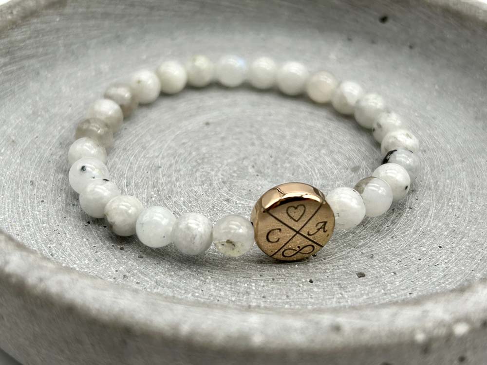 Das Armband wird auf elastischem Gummi aufgefädelt, was das An- und Ausziehen besonders einfach macht. Gerne fertigen wir Ihr Armband exakt nach Maß und versehen das Plättchen mit einer persönlichen Gravur, die es zu Ihrem ganz eigenen Schmuckstück macht.