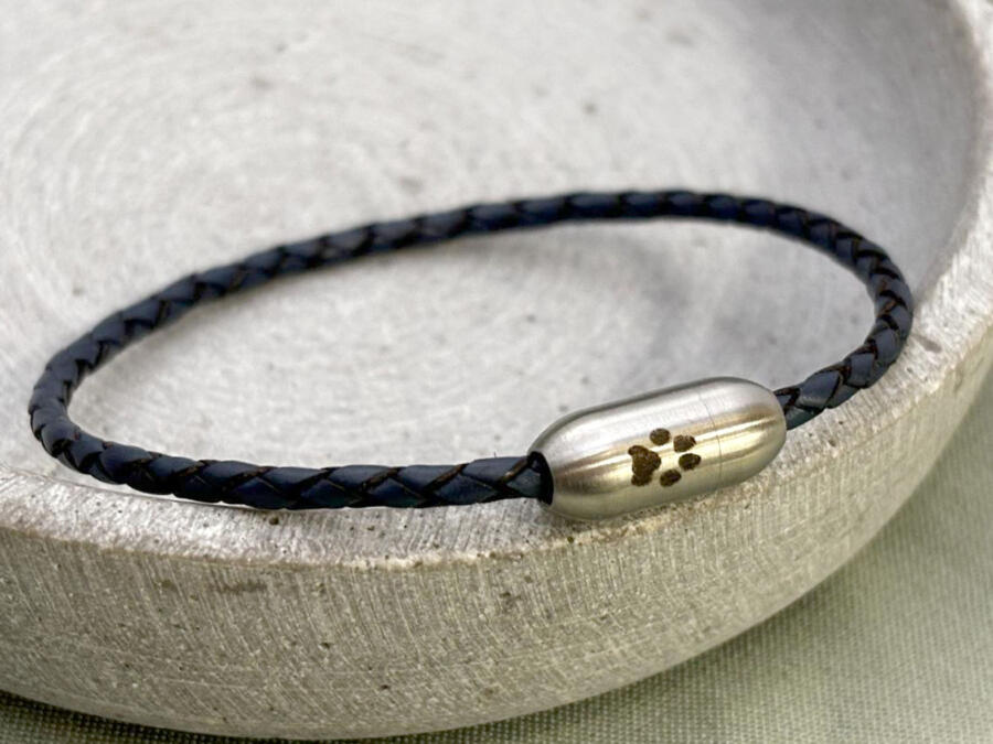 - Armband aus geflochtenem Rindsleder mit Edelstahl-Magnetverschluss und gravierbarem Würfel