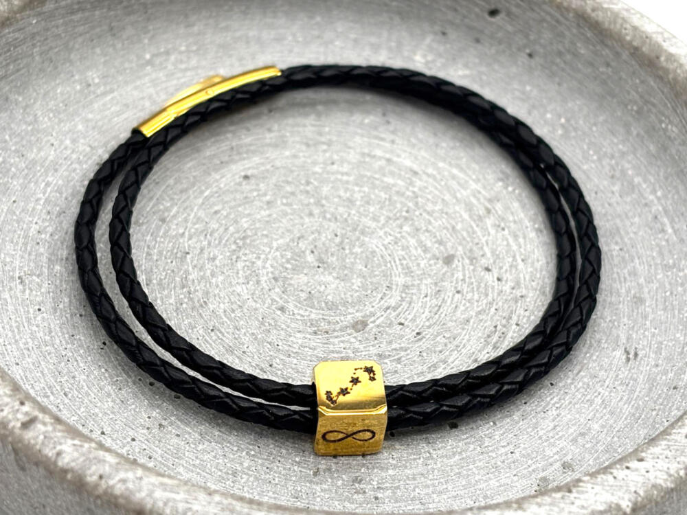 Schmales, rund geflochtenes Armband aus Leder zweifach gewickelt mit Würfel