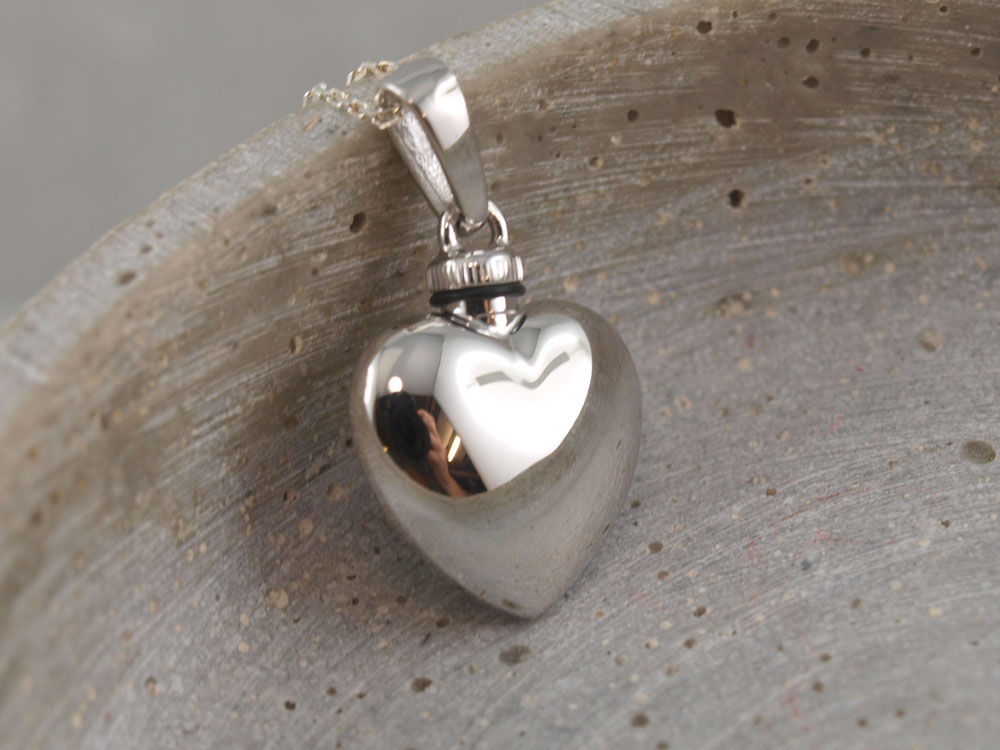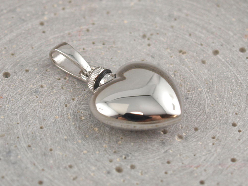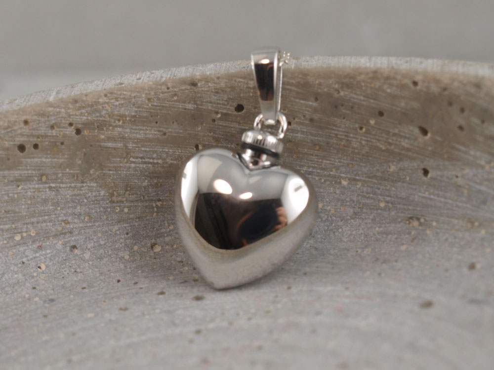 Ein stilles Zeichen der Verbundenheit. Dieser Herzanhänger aus echtem 925er Silber ist als kleiner Erinnerungsort gedacht – elegant, unaufdringlich und voller Bedeutung. Er lässt sich aufschrauben und im Inneren mit einer symbolischen Menge Asche oder einem winzigen Andenken befüllen. Die Oberfläche ist hochglanzpoliert und spiegelt das Licht weich wider. Das Herz liegt angenehm auf der Haut und kann mit einer Gravur individuell gestaltet werden. Maße ca. 17 x 19,5 mm.