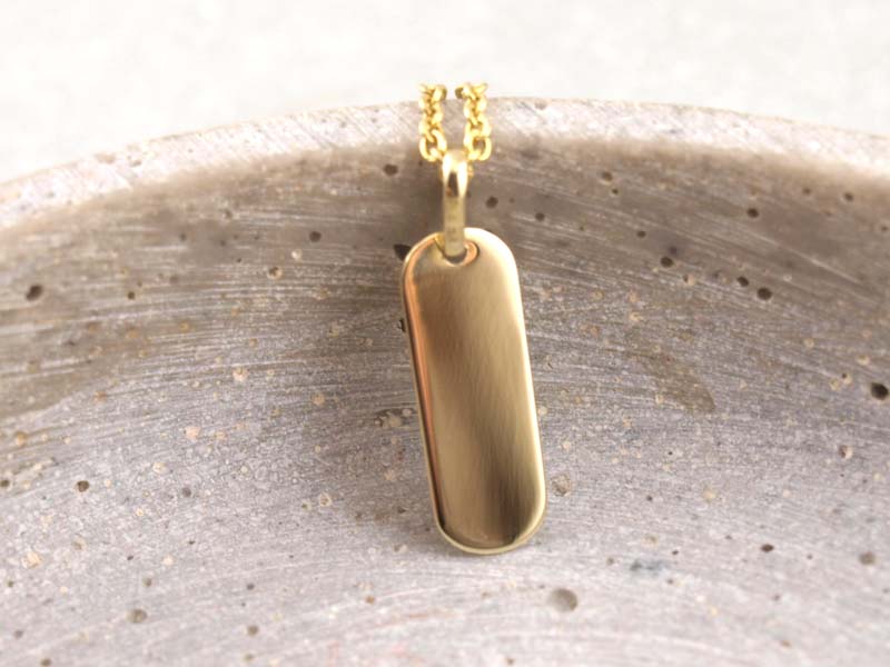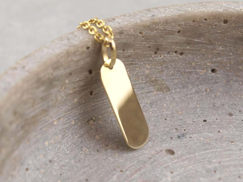 Feiner Anhänger aus echtem 333er Gold mit hochglanzpolierter Gravurplatte. Das schlichte, längliche Design eignet sich perfekt für eine persönliche Gravur wie Initialen, Namen, Datum oder ein kleines Symbol und wird so zu einem individuellen Lieblingsstück.