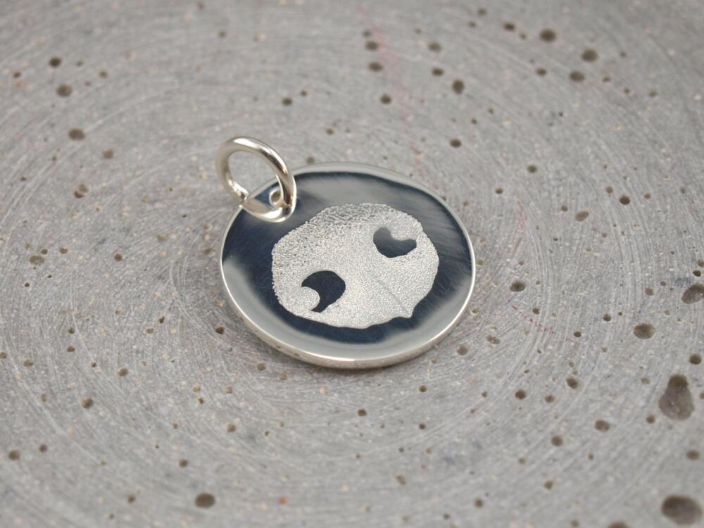 Verewigen Sie die Nase Ihres treuen Begleiters auf einem hochwertigen Schmuckstück! Unser runder Hundeanhänger graviert aus edlem 925er Silber in der Größe 16 mm ist die perfekte Geschenkidee für Tierfreunde und Hundebesitzer. Mit einer detailgetreuen Anhänger Gravur Hund tragen Sie die Erinnerung an Ihren Vierbeiner immer ganz nah bei sich.