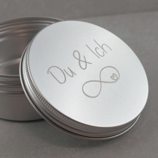 Verschenken Sie Ihre Schmuckstücke mit dieser hübschen Aluminium-Dose mit DU & ICH Gravur. Besonders in Kombination mit unseren Partnerarmbändern wird sie zu einer ganz romantischen Geschenkidee! Die Dose ist groß genug, um kleine Schmuckstücke sicher zu verwahren, und macht das Auspacken zu einem besonderen Moment. Die Gravur „DU & ICH“ mit dem Unendlichkeitszeichen (Infinity-Symbol) verleiht der Dose eine persönliche Note und zeigt Aufmerksamkeit und Liebe.