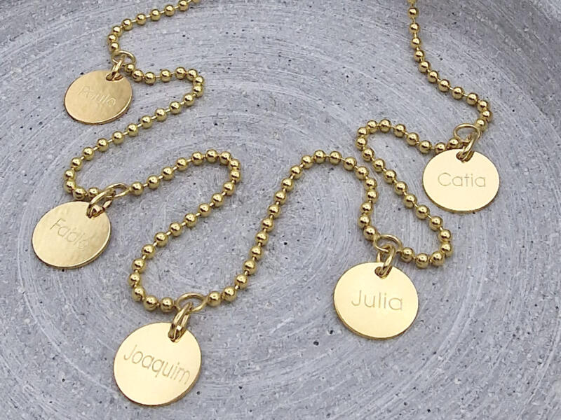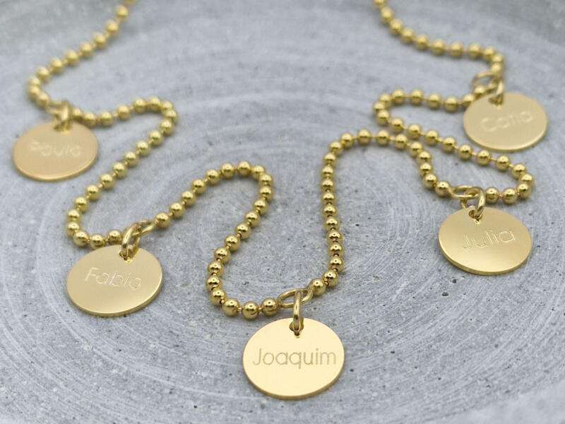 Familienkette Gold mit fünf runden Gravur Anhängern, Kugelkette, Namenskette