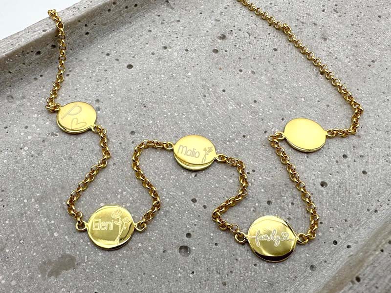Familienkette aus Silber, vergoldet mit fünf runden Gravur-Anhängern