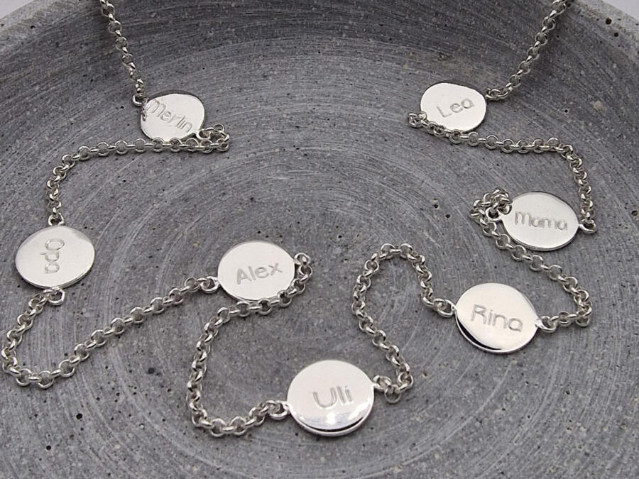 Diese moderne Familien-Kette aus 925er Silber mit Gravur-Anhängern in Form von kleinen, runden Plättchen ist etwas ganz Besonderes. Lassen Sie für jedes Enkelkind, jedes Kind oder jeden Lieblingsmenschen einen Anhänger gravieren. Sie haben hier 7 Plättchen zur Verfügung. Natürlich sind auch die Namen Ihrer Vierbeiner möglich! Diese Kette mit Gravuranhängern ist die perfekte, persönliche Geschenkidee.
