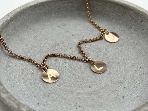 Diese wunderschöne Namenskette aus 925er Silber Rosevergoldet mit Gravur-Anhängern in Form von kleinen, runden Plättchen ist etwas ganz Besonderes. Lassen Sie für jedes Enkelkind, jedes Kind oder jeden Lieblingsmenschen einen Anhänger gravieren. Natürlich sind auch die Namen Ihrer Vierbeiner möglich! Diese Kette mit Gravuranhängern ist die perfekte, persönliche Geschenkidee. Welche Oma, Mama oder Katzenmama würde sich nicht freuen, alle Ihre Lieblingsmenschen oder Tiere nahe am Herzen zu tragen?