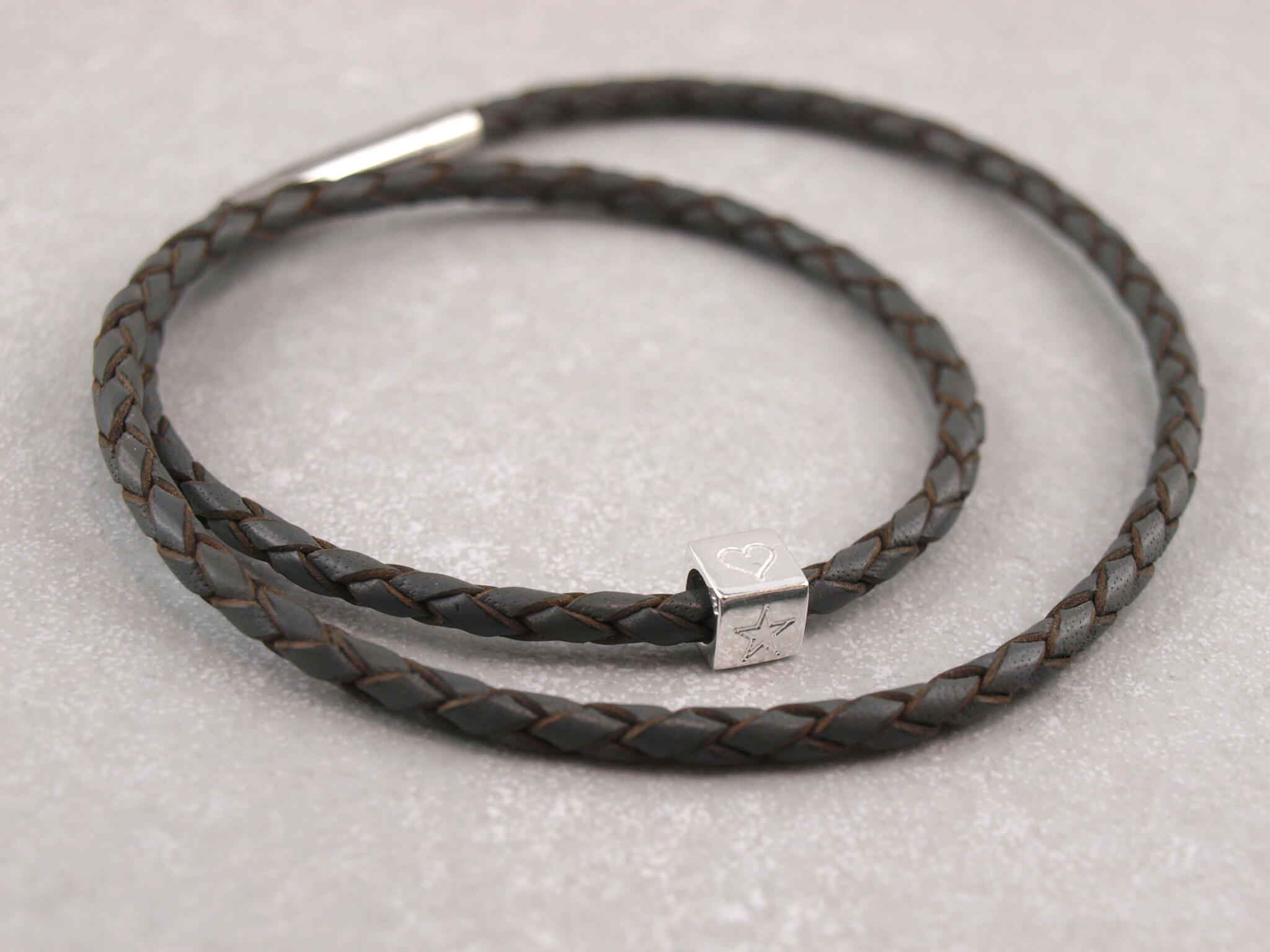 Diese geflochtene Lederkette wird aus echtem Rindsleder gefertigt. Die Kette ist in vielen Farben erhältlich. So haben Sie beispielsweise die Auswahl zwischen klassischem Schwarz, Beige, Grau oder Braun. Die Kette wird mit einem hochwertigem Hebelverschluss aus Edelstahl einfach und sicher geschlossen. Das rund geflochtene Leder ist ca. 2,5 mm breit. An der Kette ist ein Würfel befestigt, den Sie nach Ihren Wünschen auf 4 Seiten gravieren können.