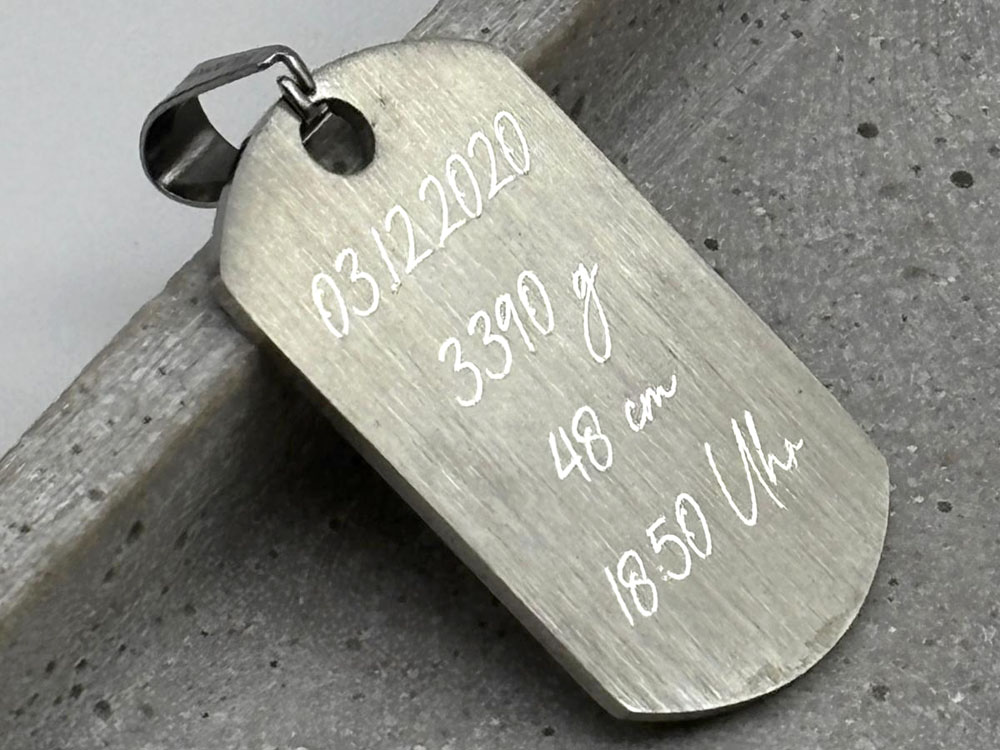 Auf den Kettenanhänger für Ihren Mann gravieren wir auch Zeichnungen, Logos oder das Familienwappen. Auch der Pfotenabdruck des Hundes, der Handabdruck der Kinder, der Fingerabdruck des Vaters oder der Fussabdruck des Babys. Herrenketten sind ein sehr beliebtes Geschenk, denn auch Männer tragen Ihre Lieben gerne nahe am Herzen als Talisman!