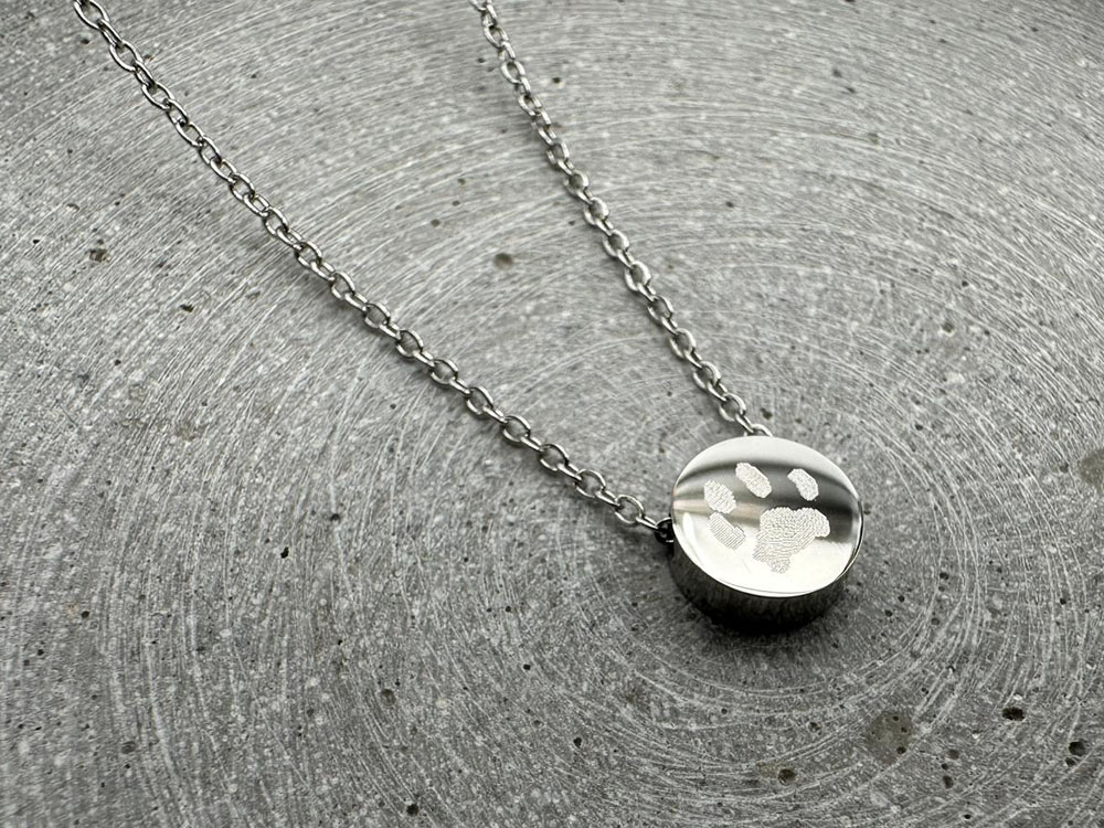 Diese Kette wurde aus Chirurgenstahl gefertigt und ist in den Farben Silber und Gold erhältlich. Sie wird durch einen kleinen Gravuranhänger mit etwa 8 mm Durchmesser geziert, welcher sich mit einer individuellen Gravur versehen lässt. Verschenken Sie diese Kette oder machen Sie sich selbst eine Freude. Ein ganz persönliches Geschenk, welches aufgrund des Materials auch für Menschen mit empfindlicher Haut gut geeignet ist!