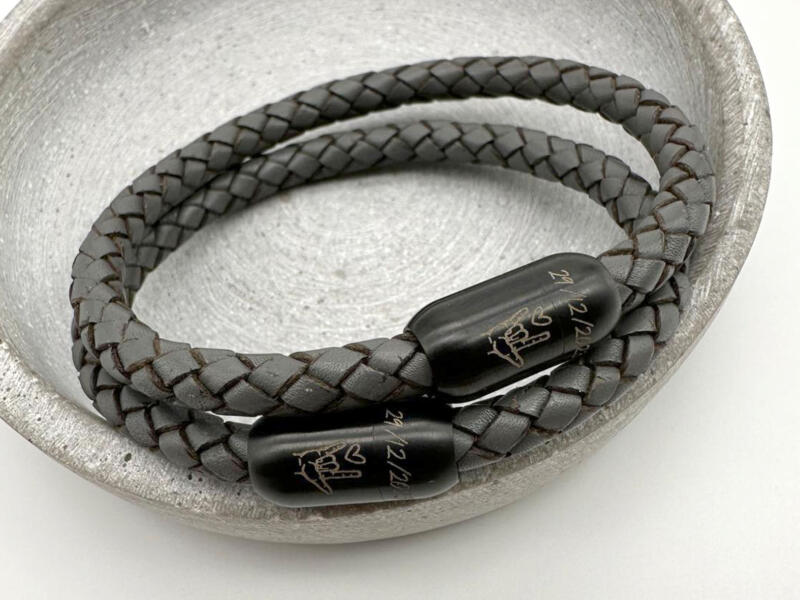 • Armband-Set aus geflochtenem Rindsleder mit gravierbarem Edelstahl-Magnetverschluss