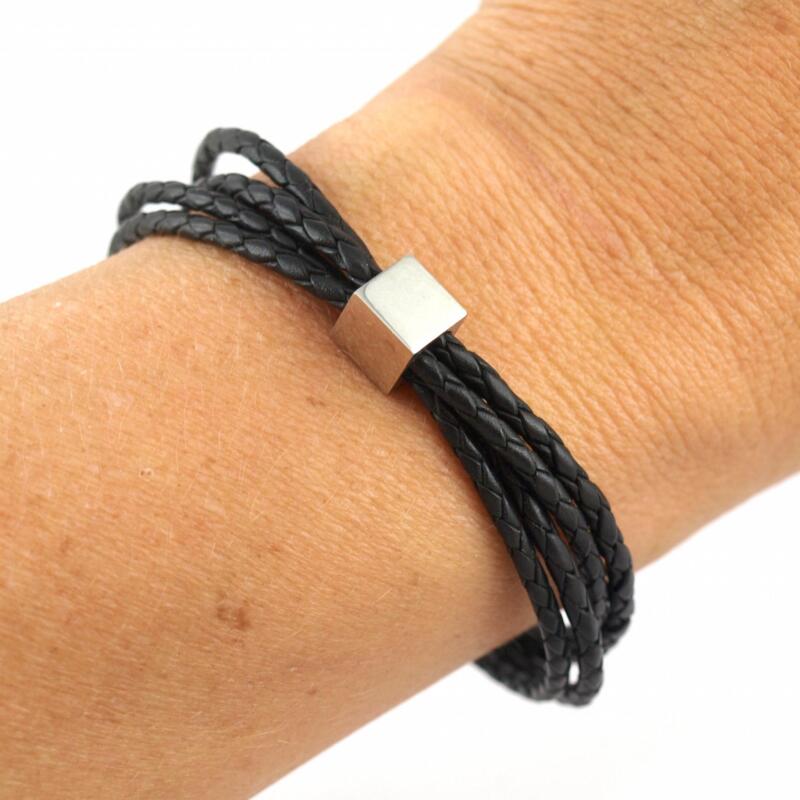 - 2 Armbänder aus geflochtenem Rindsleder mit Edelstahl-Magnetverschluss und gravierbarem Würfel