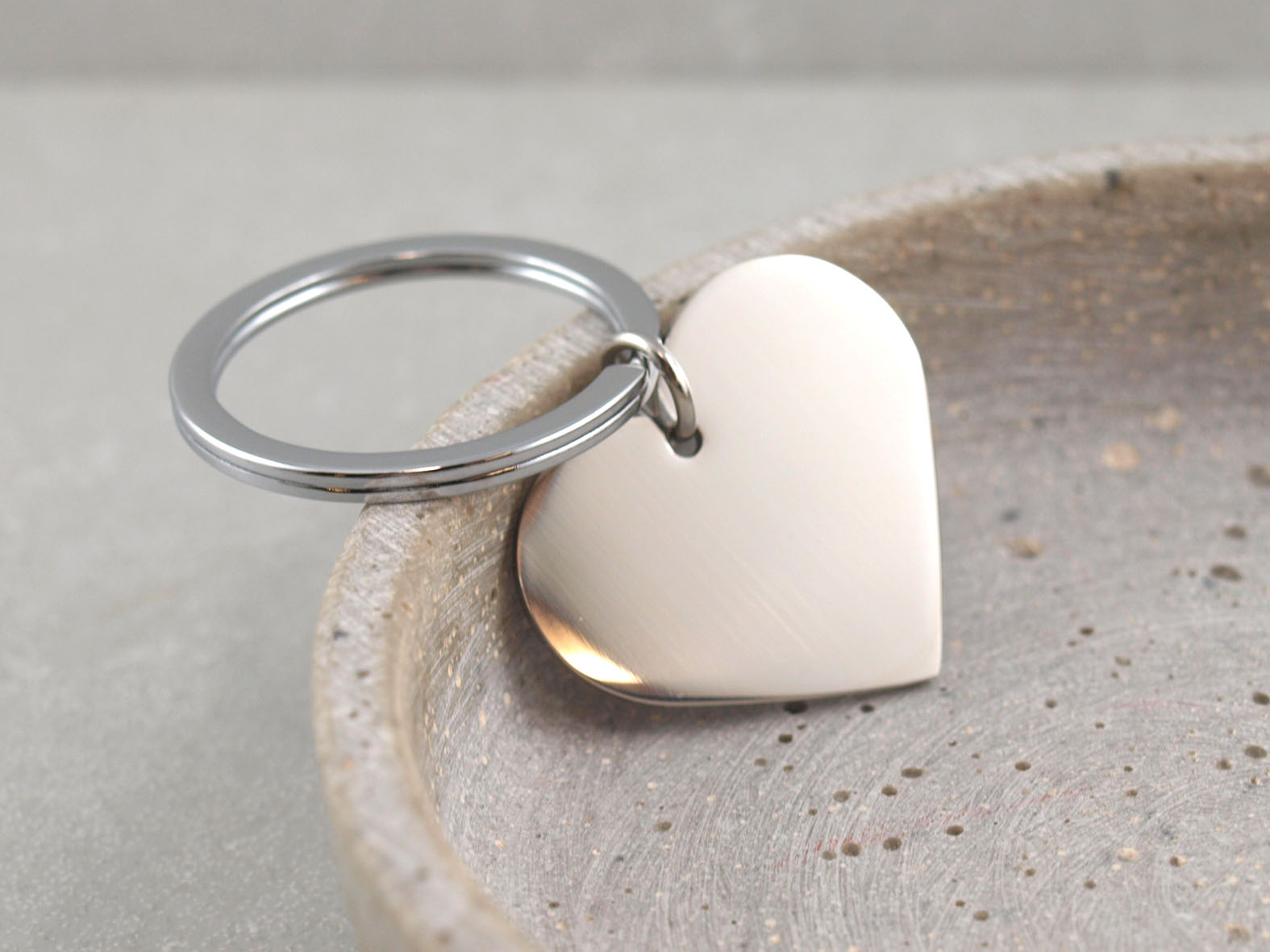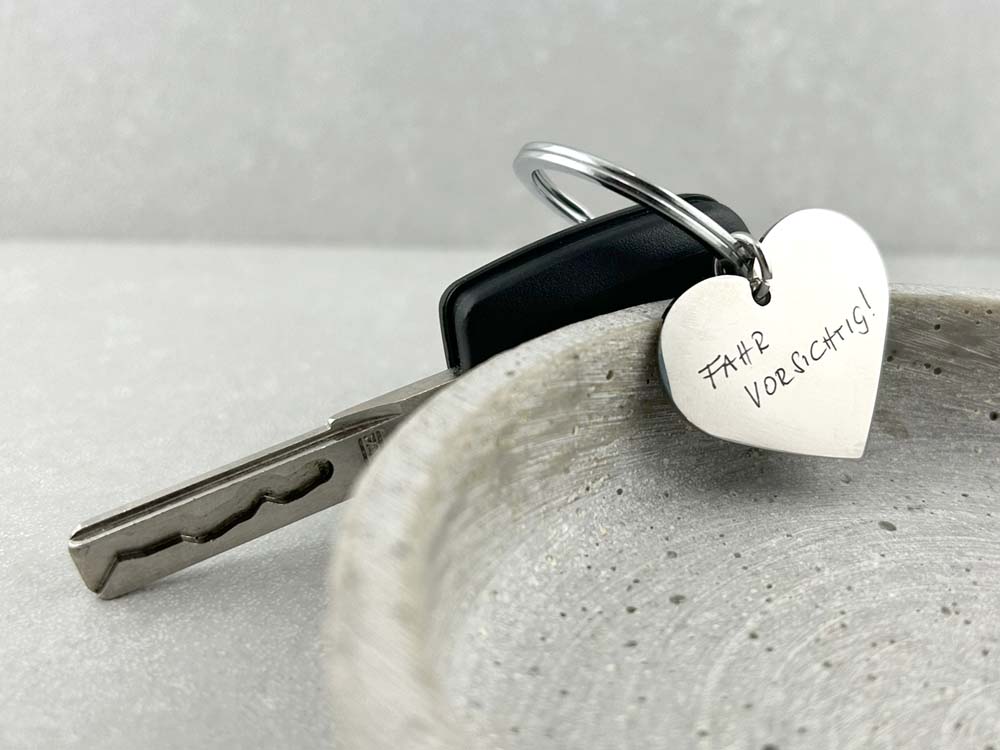 Ein kleiner Begleiter mit Bedeutung. Dieser Herz-Schlüsselanhänger aus Edelstahl verbindet schlichte Form mit beständiger Qualität. Das feine Mattfinish lässt ihn edel wirken und macht ihn zugleich robust genug für den täglichen Gebrauch. Mit seiner klaren Kontur und angenehmen Haptik liegt er gut in der Hand und erinnert bei jedem Griff an das was wichtig ist. Auf Wunsch kann die Vorder- oder Rückseite mit einer individuellen Gravur versehen werden – ein Name, ein Datum oder ein Wort mit persönlicher Bedeutung. Maße ca. 30 x 26 mm.