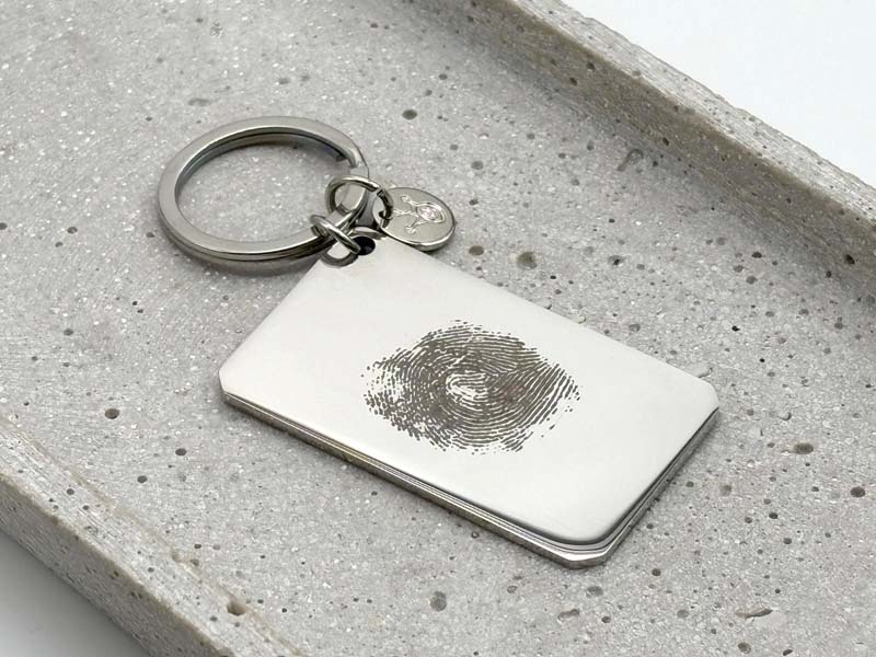 Dieser rechteckige Schlüsselanhänger mit abgerundeten Ecken ist sowohl elegant als auch robust. Er kann wahlweise in Silber oder Schwarz gefertigt werden und ist mit einem hochwertigen Schlüsselring versehen. Die Vorderseite lässt sich mit einem Foto gravieren, während die Rückseite Platz für Namen, kleine Botschaften oder Symbole wie Herzen und Unendlichkeitszeichen bietet. So wird jeder Anhänger zu einem Unikat, das Emotionen und Erinnerungen einfängt.